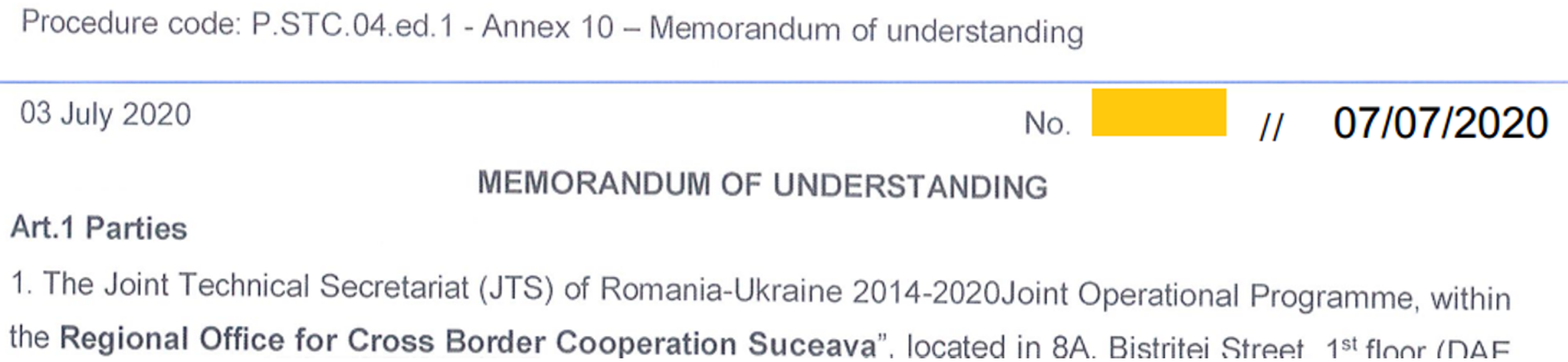 The Joint Technical Secretariat (JTS) of Romania-Ukraine 2014-2020 Joint Operational Program, withing the Regional Office for Cross Border Cooperation Suceava, located in Suceava, Suceava County, Romania, and the Non-Government Organization "Academy of Modern Technologies", located in Ivano-Frankivsk city, Ivano-Frankivsk region, Ukraine, have signed the Memorandum of Understanding on 03 July 2020.